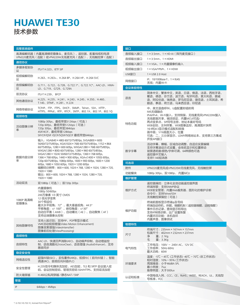 华为视讯高清终端TE30